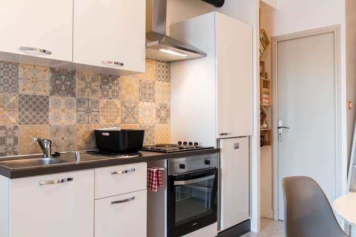 Ancien appartement Nantais rénové, pièce principale avec cuisine, lit 2 personnes, salle de bain. Stationnement gratuit dans la rue et alentours.